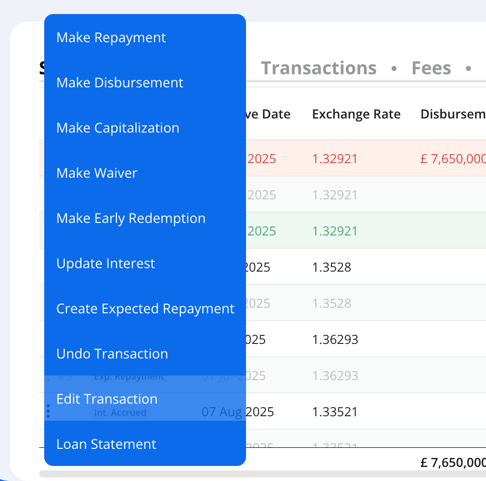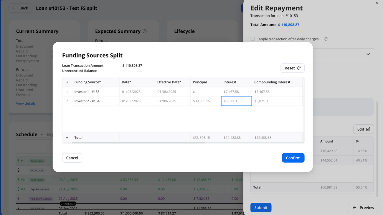 You can manually define how a loan transaction (such as a disbursement or repayment) is split between multiple funding sources. This gives you precise control over allocation when a loan is financed by more than one entity.